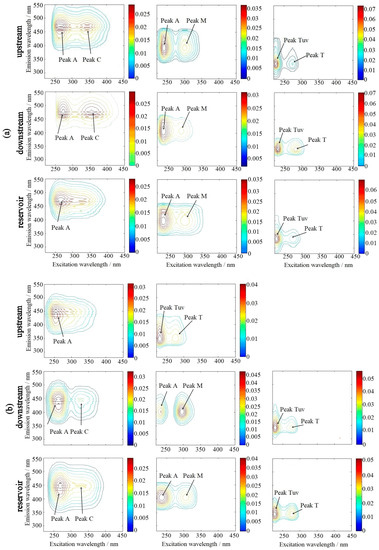 In essence, the river water downstream was most influenced by seawater invasion under high water temperature in the drought season. The fluorescent intensity of organic fractions generally increased with the seasonal changes [9], but upon entering the winter, humic-, fulvic-, and protein-like moieties all decreased whether in upstream or reservoir water, which caused the total fluorescent intensity to decrease from 1726 QSU in summer (ARE) to 1095.4 QSU in winter. Actually, the spatio-temporal variation of DOM in the catchment was not only related to physical migration of materials from land to water and from upstream to downstream, but also to the chemical transformation of the organic fraction [6]. The fulvic acid-like moiety in upstream water was not detected in summer (BRE) or in winter, but the humic- and protein-like proportion in these two seasons was elevated instead, presumably because of low precipitation in both timescales during the sampling period.