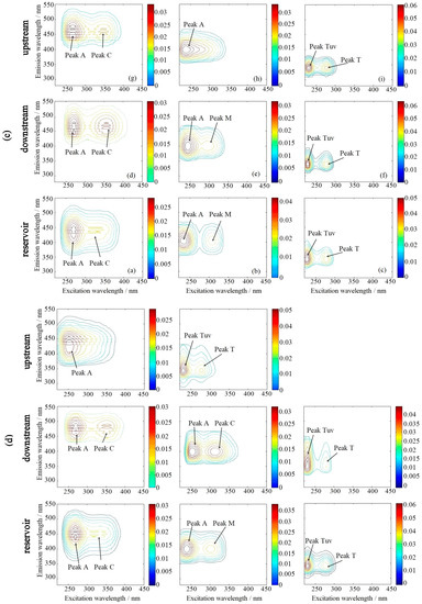 Four types of fluorescent components were validated in samples of the Duliujian River catchment in different seasons (Figure 2). Component 1 was traditionally defined as terrestrial humic-like fluorophores with two peaks (humic-A: Ex/Em = 245~270/440~477 nm and humic-C: Ex/Em = 325~355/440~470 nm) (Figure 2). Similar terrestrial humic like substances are reported elsewhere in surface waters [26,27,28,29,30,31]. Component 2 was typically categorized as terrestrial fulvic-like substances with two peaks (fulvic-A: Ex/Em = 235~295/391~407 nm and fulvic-M: Ex/Em = 235~315/391~407 nm) (Figure 2), apart from downstream water in summer BRE (A: and M:) which was denoted as autochthonous fulvic acid-like substances that are derived from phytoplankton whereas peak M intensity is greater than peak A (Figure 2; 27). Autochthonous fulvic acid-like substances of phytoplankton origin was further confirmed by the absence of terrestrial fulvic acid-like substances in upstream locations (Figure 2). Similar terrestrial fulvic-like substances are reported elsewhere in surface waters [30,31]. Component 3 was previously reported as resembling low-molecular-weight protein-like fluorophores with two peaks (protein-TUV: Ex/Em = 225~230/337~350 nm and protein-T: Ex/Em = 275–280/337~350 nm) (Figure 2). The third component-protein-like substances are of phytoplankton origin, as reported elsewhere [29,30,31,32]. In addition, a strong linear correlation between humic-A/C and fulvic-A/M (r = 0.97, p < 0.01) in the whole SCs in baseflow was observed in each season, implying that humic-/fulvic-like DOM may have the same terrestrial source, but bulk DOM was originated from autochthonous materials which could be reflected by the fluorescent index (FI) value of 1.98. The site K2 has the highest fluorescent intensity of humic- and fulvic-component for reservoir water, with a variation trend of increasing-decreasing. Both components at K2 were as high as 363.9 and 336.7 QSU in summer (ARE). The HIX values in summer (mean: 2.83) were higher than those in spring and winter (mean: 1.84 and 2.55), and the BIX values in summer (mean: 1.00) were lower than those in spring and winter (mean: 1.02 and 1.09).