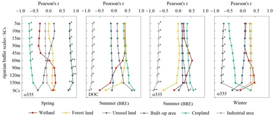The effect of land-use types on a335 appeared to exhibit seasonal differences with buffer distance, with CDOM content in winter mainly affected by unused land (Figure 4d). The content of CDOM or DOC seems to be strongly associated with the industrial land in summer, even in the whole SCs, especially after a rainfall event (Figure 4b,c). Storms are vital in the catchment for the annual output flux of DOC, with shifts in the biodegradability and chemical quality of DOM [45], and more storms in summer may be the driver of CDOM variance, especially in the monsoon zone [9]. Land use in SCs or farther riparian buffer zones (such as a 150 m scale) was concentrated and contiguous (Figure 4c), and CDOM was also affected through a nonpoint source, like cropland and unused land (p < 0.05), except for industrial land after a storm. Comprehensively taking into account the significant correlations between land use of different types and DOC or CDOM, it is shown that 60 m and the whole SCs were the critical buffer distance and the key research area.