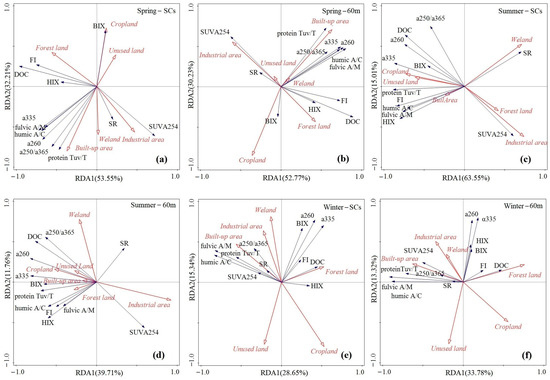 Redundancy analysis (RDA) of the correlation between multiple land-use types and CDOM specific UV absorption coefficient, and the fluorescence peak intensity in the SCs (a–c) and riparian buffer zones of 60 m (d–f). (a,b) the results in spring; (c,d) the results before rainfall in summer; (e,f) the results in winter.