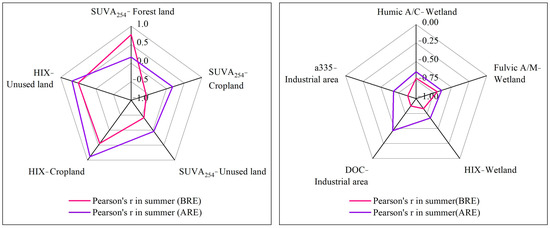 Comparison of correlations between characteristics of DOM and land-use types in SCs before/after rainfall in summer. BRE: before a rainfall event; ARE: after a rainfall event.