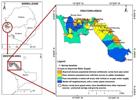 Study Area: Freetown city, the national capital of Sierra Leone, covers an area of 81 km2 (Figure 1). Data from the Sierra Leone Statistics Office indicated 229,951 households with a population of 1.055 million in the urban and sub-urban neighbourhoods []. The primary source of water supply in Freetown is piped water from the Guma Valley Water Company (GVWC), which is the only service provider. GVWC is a parastatal institution that is 99% owned by the Government of Sierra Leone and 1% by the Freetown City Council []. Alternative sources or multiple household water sources (MHWS) [] include water stored in tanks, wells, boreholes, springs, gravity pipes, streams pond rivers, etc. In the rainy season, rainwater is collected in buckets under the roof or through structures that divert rainwater into large tanks and containers. Freetown experiences the African monsoonal rainfall type, which can be very torrential and makes it difficult to collect rainwater.