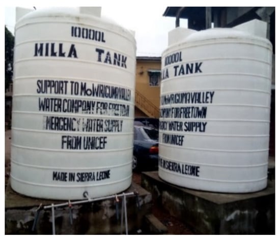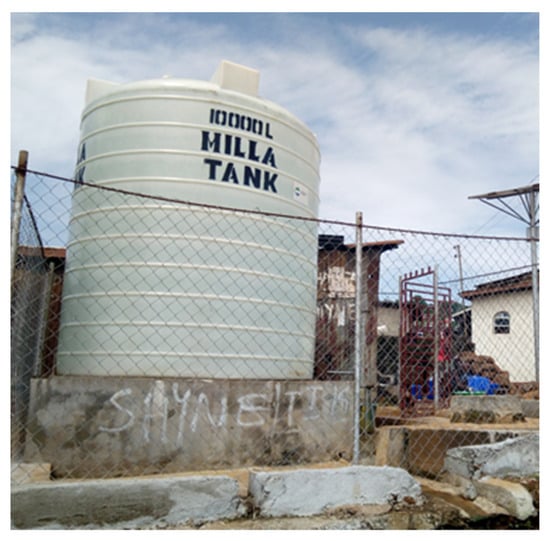 The survey revealed that only 33% of households have private connections to a piped water supply. The piped water supply is rationed on alternate days during both seasons throughout the study area and supplied for less than twenty-four hours. It is the primary source for households where it exists. Table 1 presents the households’ percentage access to the different MHWS in the rainy and dry seasons. The table shows an increase or decrease in percentage use by households during the dry season in the study area. These sources include small-scale water sellers using pushcart to sell water in 22 litre jerry-can containers referred to in this research as vendor water, and water sold by tanker truck bowsers referred to here as tanker bowser water [,]. The pattern by which the households access their water sources showed that the middle- and high-income groups have the highest access to piped water and other water sources like bowser and bottled. Rainwater, gravity/spring and surface water are the prominent improved and unimproved sources for the lower-income households in the area, as well as for all households during the dry season when taps are closed for longer periods []. Water stored in tanks is provided and paid for communities’ use by Nongovernmental Organisations (NGOs) and distributed to ten-thousand-litre containers stationed at certain deprived stand piped points in the study area. An example of this is shown in Figure 2 and Figure 3. Packaged water is water sold in sachets, purported to be of better quality from water cottage industries mainly for drinking purpose. Some households reported saving rainwater in containers for use in the dry season, as well as households using packaged water for cooking light meals. At every improved and unimproved communal water point, households maintain a system to distribute equitable fetching and water collection time.