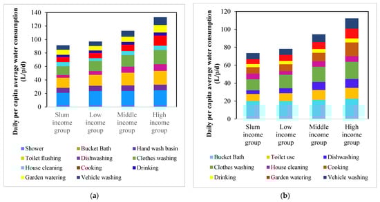 Here, a household’s total water consumption is divided into a number of micro-components: Showering, bucket bath, toilet flushing, house washing, cooking, dish washing, clothes washing, wash hand basin, garden watering and vehicle washing. The distribution of average daily use of each of these components in all income groups is shown in Figure 6a,b. Only some of the households recorded shower, hand wash basin and cistern flush use. Of the 398 surveyed households, none were recorded to have a swimming pool. However, some households recorded owning a garden area (34%) and vehicle (61%). In agreement with [], daily per capita consumption decreases with the number of household occupants.