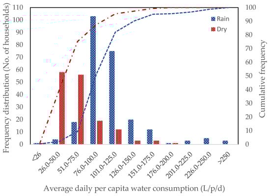 The frequency distribution of the total average daily per capita water consumption for the whole sample is shown in Figure 5, signifying that the average is about 93 litres per capita per day (L/p/d). The average daily per capita water consumption for households with a piped connection is 112 litres per capita per day (L/p/d). These amounts are higher than the nationwide estimated per capita volume by the [] set at 40 L/p/d with only piped water use. This total average water consumption is the volume of water obtained via the various multiple sources, as indicated in Table 1. Per capita consumption varies from 73 to 112 (L/p/d) for households without pipe-water connections where showering, toilet flushing and hand wash basin use are absent, and from 91 to 133 (L/p/d) where showering, toilet flushing and hand wash basin tap use are common. The increase in male members and children in the household increases per capita consumption. This increase in per capita consumption for males seems to be because a high percentage of men are engaged in daily employment and use water for personal hygiene, probably washing clothes more than other members of the family daily. The high consumption for children is because they need to be cleaned more often than adults or elders in the household.