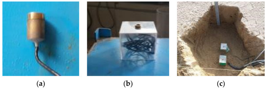 Installation process of the pore water pressure sensor: (a) sensor; (b) sensor inside the acrylic case; (c) sensors buried at the planned location.