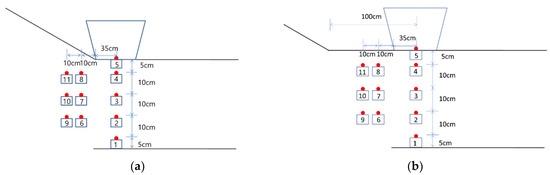 Figure 5 shows the buried position diagram of the pore water pressure sensors. There were two experimental cases. In case 1, the hydraulic well was installed 35 cm apart from the slope toe of the experimental embankment. As shown in Figure 5a, the pore water pressure sensors were placed at 10 cm intervals in the ground. Unlike case 1, in case 2, the hydraulic well was installed at a distance of 100 cm from the slope toe, and the arrangement of the pore water pressure sensors was the same as in case 1 (see Figure 5b).