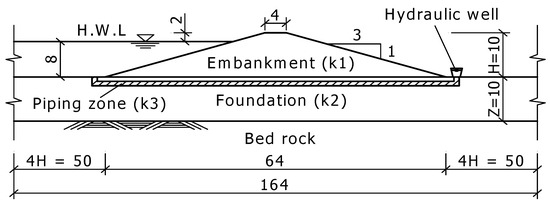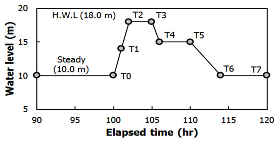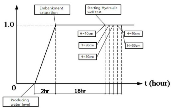The unsaturated property of each soil applied to the seepage analysis is shown in Table 2 of Section 4.1.2 presented by Carsel and Parrish (1988) [13]. In order to examine the effectiveness of the hydraulic well, the water level curve in Figure 18 was used, which was induced from the Nakdong River embankment in Korea [5,14].