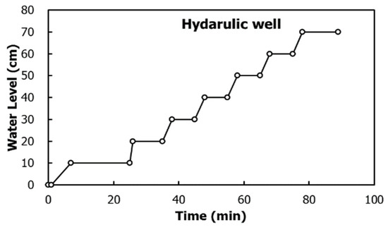 In this experiment, the hydrograph of the riverside is shown in Figure 6. After the embankment construction was completed, the full water level was produced for 2 h at the riverside. The hydraulic well experiment was performed after 18 h to saturate the embankment. Figure 7 shows the water level of the hydraulic well. It was increased by 10 cm every 10 min.