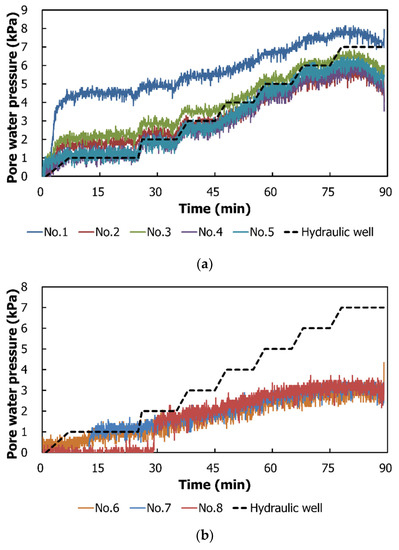 Figure 9b shows the variations in the pore water pressures by ground depth at the point 45 cm away from the hydraulic well. The No.6 sensor was installed at 25 cm underground, the No.7 sensor at 15 cm underground, and the No.8 sensor at 5 cm underground. The pore water pressure changed due to the variation in the water level in the hydraulic well. Further, the pore water pressure became smaller as it got closer to the surface due to the influence of the phreatic line. Moreover, the pore water pressure was generated smaller than the water level of the hydraulic well.