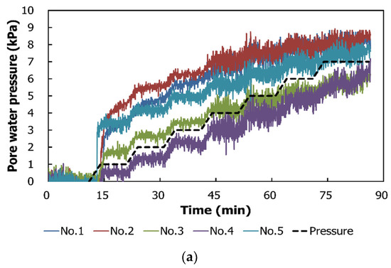 Figure 9 shows the experiment results of case 2. Figure 9a shows the variations in the pore water pressures by ground depth at the point where the hydraulic well was installed. The pore water pressure of sensor No.1 at 35 cm underground was estimated to be about 2~4 kPa higher than the water level of the hydraulic well because the embankment was saturated and the phreatic line was generated, the same as in case 1.