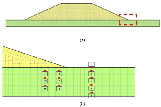 Location of pore water pressure sensors and mesh of embankment: (a) geometry and mesh; (b) pore water pressure sensor location.