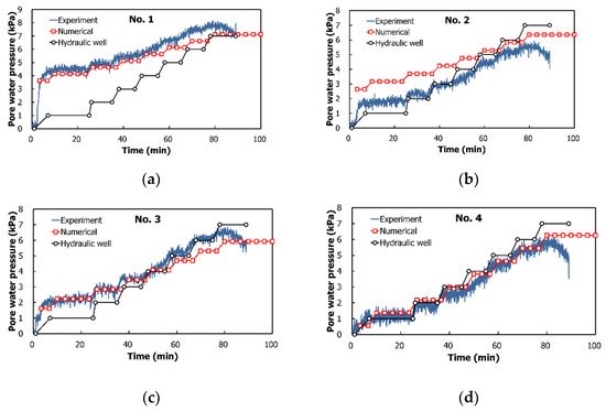 Figure 16 shows the pore water pressures 55 cm apart from the hydraulic well. The numerical analysis result was calculated as approximately 3 kPa higher than the experimental result in the early stage of the No.9 sensor at 25 cm underground (Figure 16a), but the difference decreased as the water level of the hydraulic well increased. Both the No.10 sensor at 15 cm underground (Figure 16b) and the No.11 sensor at 5 cm underground (Figure 16c) showed the same trend as the No.10 sensor.
