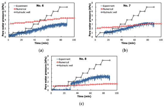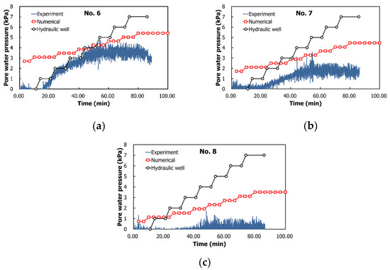 Comparison of pore water pressure of experiments and numerical analysis of case 2 (45 cm separation site): (a) No.6; (b) No.7; (c) No.8.