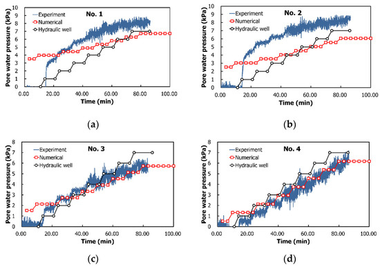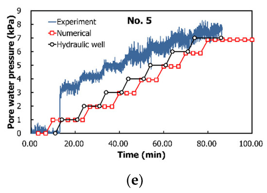 Comparison of pore water pressure of experiments and numerical analysis of case 2 (hydraulic well installation point): (a) No.1; (b) No.2; (c) No.3; (d) No.4; (e) No.5.