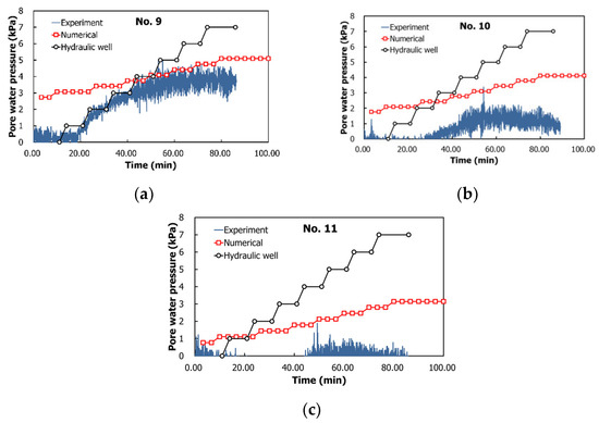 Comparison of pore water pressure of experiments and numerical analysis of case 2 (55 cm separation site): (a) No.9; (b) No.10; (c) No.11.