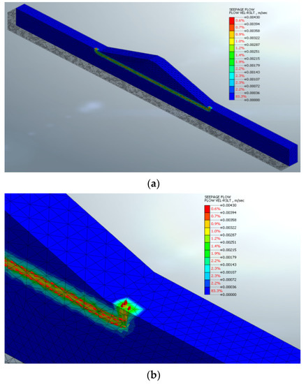 Analysis result of seepage velocity (HWL = 18.0, time = 105 h): (a) embankment view; (b) seepage velocity of piping guide part.