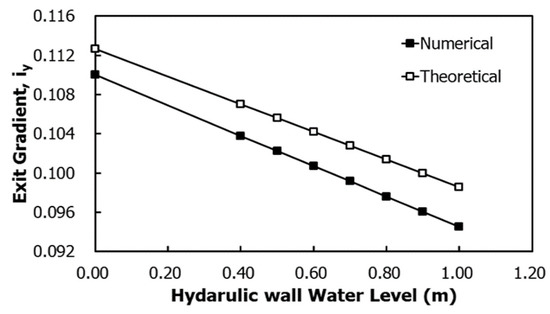 Table 5 shows the theoretical hydraulic gradient according to the hydraulic well level () using Equation (5). As the water level of the hydraulic well increases, the difference in the water level between the riverside and the protected side decreases, so the theoretical hydraulic gradient is reduced by Equation (5).
