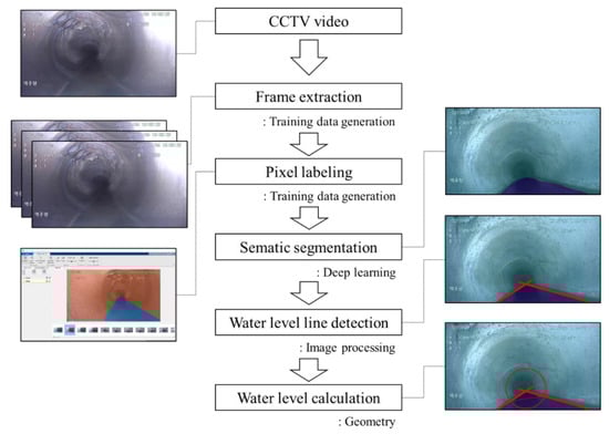 Figure 1 shows the overall process of this study. Deep learning starts with creating training data. By decomposing CCTV into frames and extracting frames relatively evenly from all sections, 283 training images were selected. These images were divided into a water area and a pipe area by pixel labeling. 60% of the labeled training image data were utilized for training, while 20% was used for verification and was used 20% for testing. Moreover, images were randomly separated. A new network for deep learning was created using DeepLab v3+ based on pre-trained ResNet-18 for fitting the image size and label. ResNet-18 is a convolutional neural network (CNN) that classifies images [], and DeepLab v3+ is a CNN designed for labeling images []. An optimization algorithm, stochastic gradient descent with momentum (SGDM) [], was used for training. The learning rate was reduced by a factor of 0.3 every 10 epochs and the network was tested against the validation data every epoch. Further, mini-batch size of 2 was used to reduce the memory usage during training []. Training was repeated 2190 times in total in 30 epochs for 45 min, which ended with 98% accuracy. The training process was calculated using the GPU NVIDIA Quadro P5000 16GB. CCTV footages were divided into water and pipe areas through this network, and this process is called semantic segmentation.