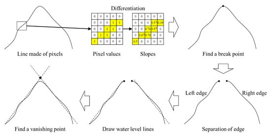 This edge was a mountain-shaped line, as shown in Figure 2, and the line was differentiated. However, because images are pixels, they cannot be differentiated. Instead, using the features of the pixel, a 5 × 5 matrix was extracted around a data point, and the slope was extracted by obtaining a linear equation from the data points by the least squares method. Based on the slope value, a break point that forms the reference of the left and right edges can be obtained. Based on this break point, two linear equations were obtained from the left and right edges by the least squares method. These equations correspond to the water level lines of the sewer, and the point where the two lines meet is the vanishing point. An imaginary circle was drawn around the vanishing point, from which the distance (d) between the chord and the circle was obtained, and then the water level was further calculated in proportion to the diameter of the sewer pipe []. This process was applied to the entire CCTV footage.