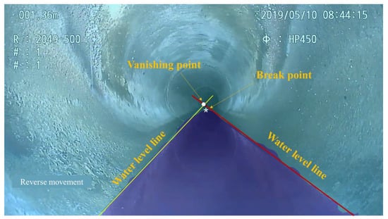 The boundary line between the two areas is the line representing the water level. The area segmented by semantic segmentation is uneven. This is because the boundary between the water and pipe areas is ambiguous, and the concrete pipe is always wet and contaminated due to the constantly changing water level; thus, it is not easy to graphically distinguish between water and pipe areas. However, even under these conditions, the break point and least squares method were used to obtain the most interpretable water level lines. As a result, two water level lines and a vanishing point were obtained.