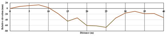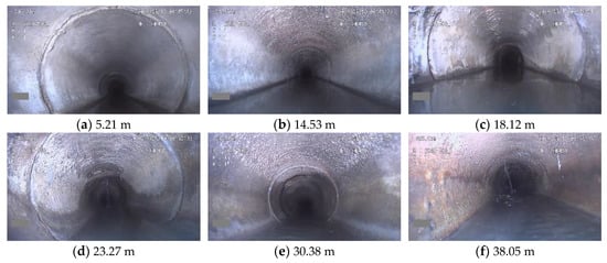 Figure 7 shows the relative elevation. From 0 to 10 m, the sewer pipe was slightly raised and then deflected. In particular, the deflection is the most significant between 15 and 25 m. In South Korea, the allowable construction error of sewer pipes is ±30 mm. At 25 m, the maximum deflection is 67 mm, which exceeds the allowable construction error by two times or more. This can also be intuitively checked in the CCTV footage. In Figure 8a, the water level is low, whereas the water level is high in Figure 8b,c. The water level becomes lower in Figure 8d,e and then higher again in Figure 8f.