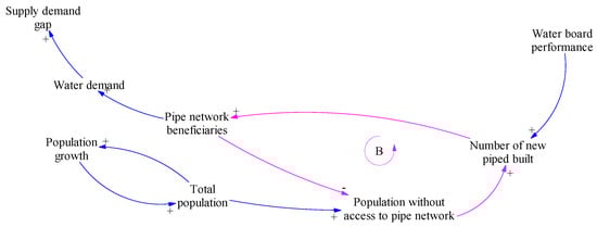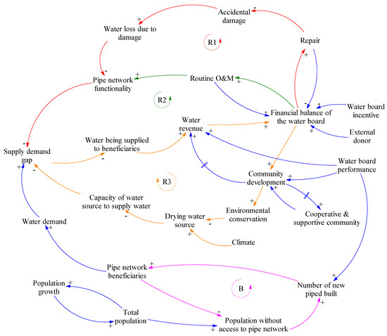The loops of the sub-models R1 and R2 are reinforcing (Figure 3). A well-functioning water pipe network will reduce the supply–demand water gap in the community. Besides, the more the community receives the water, the more water fee is being paid, and this will positively influence the financial condition of the water board and the implementation of O&M and repair.