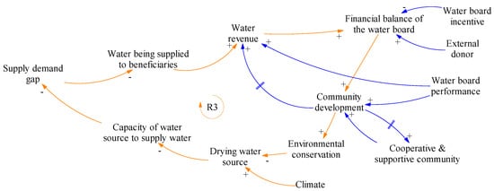 The loop R3 also indicates that the water revenue may vary depending on the season. If the water source dries up in the dry season, it will reduce the amount of supplied water and then the water revenue. This finding indicates that community development (or environmental conservation) is critical to sustaining the water board finance in the dry season.
