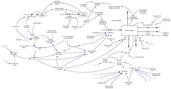Two factors influence the pipe network functionality: accidental and deliberate damage (R1) and routine O&M (R2). These two loops are separated in the CLD. The loop R1 focuses on the accidental and deliberate damage that results in water loss in the system and then influences the pipe network functionality. This accidental damage, for example, pipe stealing, damage by a wild animal, flooding, and landslide, could not be prevented or minimised by O&M measures. These kind of damages have occurred several times in that area. Hence, the assumption in the sub-model R1 that was further used in the SFD is that the O&M does not influence the occurrence of accidental damage in the water supply network and should be separated in the SFD. Furthermore, the reduction of pipe network functionality will then influence the water revenue and financial balance of the water board. The lack of money will make the water board unable to carry out optimal repairs.