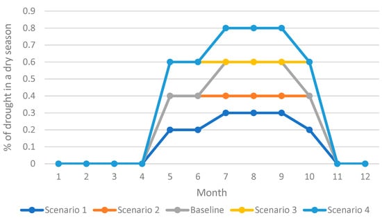 A variable “drought in the dry season” is related to the environmental aspect representing the effect of the surrounding environment, i.e., climate change or anomaly, on the capacity of the water source to supply water. A lookup function was used to set the drought value variation on each month (Figure 7). The drought pattern was made by considering the rainfall pattern and the average percentage of water reduction during the rainy and dry seasons in the Magelang regency. The dry season usually occurs between May and October. “Damage duration” and “small damage factor” are related to the technical aspect. The former represents the duration to fix any damage in the system, while the latter represents the percentage of water loss due to small accidental damage in the system. Lastly, the variable “community characteristics” is related to the social aspect representing the behavioural aspect and attitude of the community towards the PAMSIMAS project, e.g., whether or not the community is cooperative and supportive. However, we realised that some variables are related to more than one FIETS aspect, e.g., “O&M cost” and “repair cost” are also related to the technical aspect besides the financial aspect.