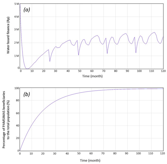 The stocks: (a) water board finance and (b) percentage of PAMSIMAS beneficiaries compared to the total population in baseline conditions. Simulation is for 120 months.