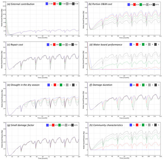 Implications of various scenarios of eight variables (a–h; see Table 2) on water board finance. Simulation is for 120 months.