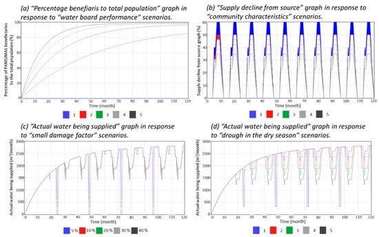 The CLD structure indicates that water board performance is critical for the pipe network growth (Figure 5). The “percentage beneficiaries to total population” graph (Figure 10a) confirmed this relationship, i.e., the higher the score of water board performance, the more people have access to piped water.