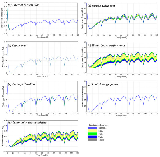 From the sensitivity analysis, we found that variable “water board performance” is the most sensitive variable, i.e., it is shown by the graph with the widest band, followed by a variable “community characteristics”, while other variables have a relatively small effect on the “water board finance” (Figure 11). Therefore, “water board performance” was the “leverage point” in the system, i.e., a variable where small changes can result in big changes in the system [30], and these need more priority in the PAMSIMAS project.