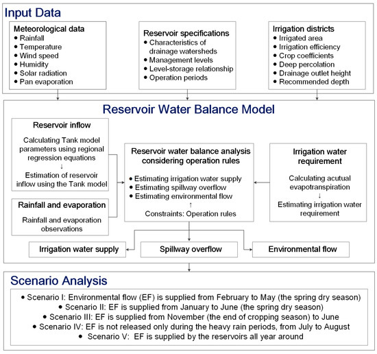 This paper proposed an analysis framework to evaluate the capacity of an agricultural reservoir as the source of EF and identify effective reservoir operation scenarios that can meet both reservoir operation goals, irrigation water, and EF supplies. The HOMWRS model was used to mathematically represent the water balance and operation of the study reservoirs. Reservoir operation scenarios for EF supply were evaluated using the model. The results showed that the scenario that concentrates on dry seasons or spring (S1: From February to May) could provide the overall largest annual amount of EF from all study reservoirs. The annual EF supply potential tends to increase with the decreases of the supply period, and the difference among the supply potentials estimated from the scenarios was significant. Such a finding indicates that annual and monthly EF supply potential can be efficiently secured by considering the seasonal variations of hydrology and reservoir water balance when determining the amount of EF supply and timing. The results also showed that the study reservoirs had supplied EF more than their simulated potential, suggesting the revision of the current EF supply plan so that both reservoir operation goals can be met. This study demonstrated that the reservoir water could be more efficiently secured by improving the reservoir operation schedule rather than simply increasing the storage capacity. The detailed investigation on the reservoir water balance and its temporal variations showed how the trade-off between the different uses of reservoir water could vary depending on hydrological conditions and reservoir operation schedules and how the overall benefits of using the reservoir water resources could be maximized by considering seasonal hydrological variations. The analysis framework proposed in this study will help improve the water use efficiency of the existing reservoirs under multiple operations objectives, improved agricultural and environmental sustainability. The proposed framework is based on simulation and scenario analysis implemented using a hydrological model, 3-Tank, which is known as applicable to a wide range of watersheds and thus expected to help explore the trade-off between irrigation and EF in other areas [36,44,45,70,71]. Reservoir operation scenarios for ET supply were evaluated using a 3-Tank model regionalized to the study areas in the analysis.