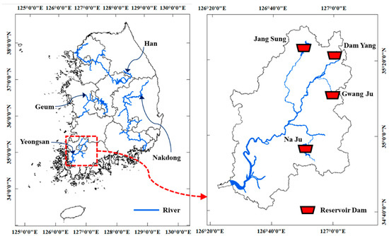 The Yeongsan River, one of the four major rivers in Korea, has 169 tributaries with two large weirs (and 1102 small dams and reservoirs) within its drainage watershed and an estuary dike at its outlet. Two new weirs were recently built, and the dams of 14 reservoirs were heightened as part of the four major rivers restoration project [34]. The river has been suffering from water quality degradation, and the issue now gets worse due to the construction of the new two weirs and resulting decrease in stream flow volume and velocity. The Korean government is trying to identify feasible and tangible ways to improve the river’s water quality and ecosystems, especially in dry season. As part of such effort, the Ministry of Environment is looking for reliable water sources to secure stable EF for the river basin.