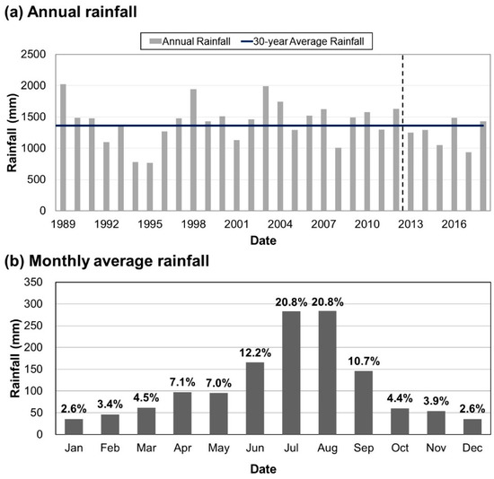 This study developed five alternative EF supply scenarios based on the information of monthly precipitation variations (Figure 3) and local irrigation practices, including water application rates and timings. Using the HOMWRS model, this study estimated the amount of water available for EF supply from the study reservoirs and evaluated the effectiveness of the five EF supply scenarios. Scenario 1 (or S1) represents four months of water supply for EF from February to May, which corresponds to the spring dry season. Scenario 2 (S2) releases reservoir water for EF during the first half of a year, January to June, before the wet season begins. In Scenario 3 (S3), reservoir water is provided for EF for eight months, from November (the end of the cropping season) to June. Scenario 4 (S4) assumes that reservoir water is not released only during the heavy rain periods, from July to August, and Scenario 5 (S5) supposes that EF is provided by the reservoirs all year round. Such scenarios considered the fact that agricultural reservoirs need to secure enough water for irrigation water supply in spring, the driest but the most water demanding season. In addition, the reservoirs should release the amount of stored water enough to protect the dams from being overtopping before the wet summer season begins.