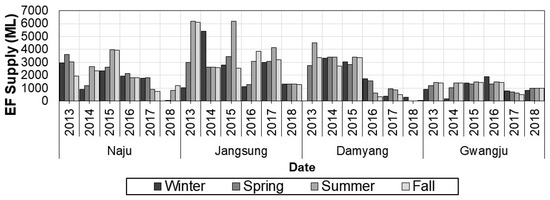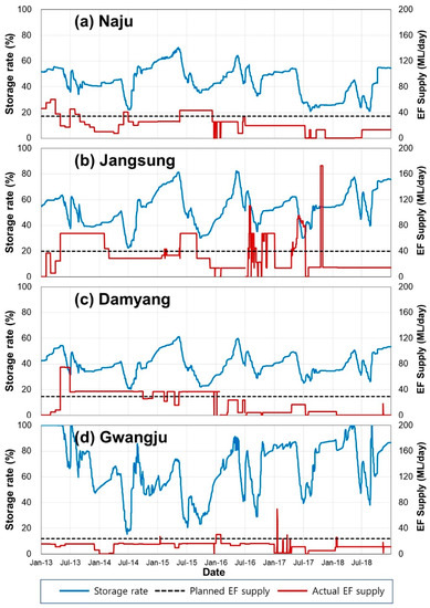 Drought is the major factor to be considered when determining the amount and timing of reservoir water release for EF. As shown in Figure 3, for instance, the annual depths of rainfall were smaller than the 30-year long-term average in 4 years out of the recent 6 years. Such hydrologic drought dropped the amount of water stored in the reservoirs and threatened the irrigation water supply. In this study, we added another reservoir operation rule to project the irrigation water supply at an annual scale, which does not allow reservoir water release for EF supply when the storage drops below the 40% of the 30-year average (The additional plan in Table 2). The threshold of 40% was adopted from the manual (“On-site Action Manual for Drought Disaster”) of Korean Rural Community Corporation for drought management [63,64]. Such an additional rule was expected to help meet the original reservoir operation goal.