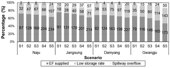 The EF supply potential increased with decreases in the supply periods, which should be attributed to the fact that the scenarios with short supply periods more efficiently focus on dry seasons and thus could increase their supply efficiency compared to others, demonstrating the trade-off relationship between irrigation water and EF supplies. The lengths of periods when reservoir water was available for EF supply corresponded to 60% to 70% of the planned supply periods (Table 4 and Figure 6). Such finding indicates that EF may not be available during 30% to 40% of the planned supply periods because of spillway-overflow or low storage rate. The length of spillway-overflow period was relatively small in the scenarios that have short EF supply periods such as S1 and S2 (Table 4 and Figure 6). Considering that the EF supply potential increased with decreases in the supply periods, it could be said that the relatively short supply period scenarios are able to more effectively manage the reservoir outflow as they can reduce uncontrolled water release. The results also suggest that an effective reservoir management plan and practices can increase the amount of water available for EF by using the surplus storage capacity that can help to control the water release schedule [1,4]. Ineffective water release during the heavy rain season can be converted to effective EF supply during the dry season by controlling water release timing.