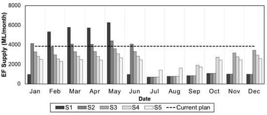 The alternative plans were compared with each other and that of the current EF supply plan in terms of the EF supply potential to evaluate their efficiency (Table 4). Although S1 has the shortest supply period of 130 days, it provided the greatest supply potential among the scenarios. On the other hand, Scenario 5 has the longest supply period and a water supply pattern similar to that of the current, but it turned out the least efficient (Table 4). The difference between the EF supply potential of Scenario 5 and the current plan was about 1 Mm3/year on average, showing no efficiency improvement. Such findings emphasize the need for a detailed investigation of reservoir hydrology and its temporal variations and highlight the importance of water supply timing (Figure 7). The monthly variations of EF supply potential provided by the scenarios show that EF supply can be concentrated in the dry season (or spring). For instance, the EF supply potential of S1 is substantially larger than those of the other scenarios and two times as large as that of S5 from February to May. In the wet season, on the other hand, S1 provides the least amount of EF supply potential, which can be compensated by uncontrolled spillway excess water release to the downstream river. Considering that the condition of streamflow and water quality in spring Korea is relatively poor, S1 should be preferred.