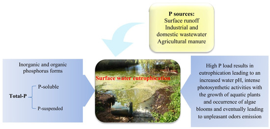 In recent decades, with the rapid growth of industry, the intensification of agriculture and the increased production of wastewaters, eutrophication has shown to be a serious threat to aquatic ecosystems. Phosphorus (P) and nitrogen (N) in a lesser extent, are important nutrients for plant growth, and their aqueous concentrations influence the trophic status of aquatic ecosystems [1,2]. Among these two elements, phosphorus has been thought for a long time to be the most important in terms of nutrition, and plant growth can be controlled by controlling dissolved phosphorus concentration [1]. Therefore, it has been considered to be the key nutrient leading to the eutrophication of reservoirs and lakes [3]. Water eutrophication is a critical environmental problem throughout the world today (it occurs when P concentrations is higher than a concentration ranging from 0.003 to 0.8 µg/L) [4,5]. Phosphorus enters the aquatic environment from a variety of sources (both point and nonpoint sources) and mainly includes urban and domestic wastewater, agricultural activities through the excessive use of chemical fertilizers, development of industrial plants and discharge of industrial wastewater, mining activities, discharge of livestock manure and aquaculture baits [6] (Figure 1). Phosphorus presence in excess in aquatic ecosystems has been reported to favor the occurrence of toxic species of phytoplankton in algal efflorescence [7]. These toxic microalgae and cyanobacteria pose a threat to human and animal health in several countries [8,9,10].