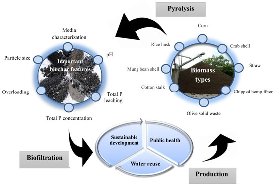 Therefore, it is essential to choose a method that is nature-friendly and has a good efficiency in terms of phosphorus removal. Biochar (carbon-rich material) is an important and effective adsorbent used to remove a wide range of pollutants in aqueous solutions [6,33]. The benefits of biochar application as an adsorbent are listed as follows: