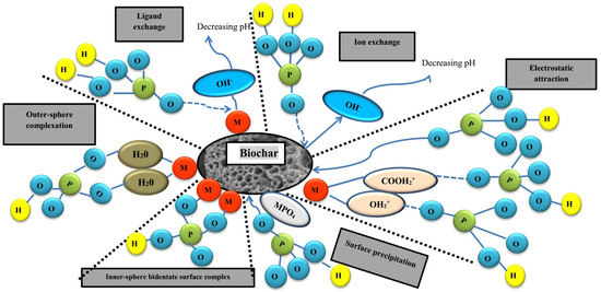 Zhang et al. [102] found that the pristine biochar surface is negatively charged, and thus, cannot easily absorb the negatively charged P. Plant-derived biochar used in the study of Zhou et al. [118] had a low zeta potential (−16.6 to −41.9 mV), meaning that electrostatic repulsion between the negatively charged surface sites and electronegative P species resulted in the lower P sorption.