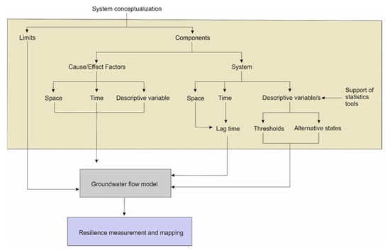 Flowchart of conceptual, operational and methodological considerations when applied to the aquifer resilience approach. The procedure has three phases: the first one, in beige, describes the data treatment and definition of key variables; the second one, in grey, the groundwater flow model; and the third one, in purple, the resilience measurement and mapping.