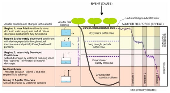 An aquifer might be considered in equilibrium under conditions of non-human perturbation. Human interventions imply the presence of processes, which are response to changes in the groundwater system [27].