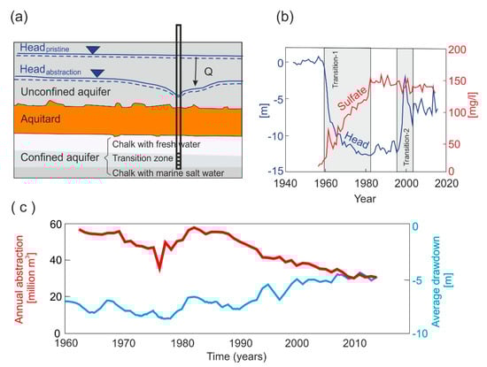 Case study of a set of confined coastal aquifers around Copenhagen (Denmark) (adapted from [8]). (a) The confined aquifer are generally formed by an upper layer of chalk with freshwater, an intermediate layer of transition zone with Mg and NaCl and a lower layer of Chalk with marine salt water. (b) Potentiometric heads from 1940 until 2014 experienced a 2–14 m decrease in the nearby potentiometric surface compared to the pre-pumping potentiometric surface recordings, meanwhile sulphate concentrations increased from less than 10 mg/L to around 140 mg/L after the maximum extraction period, compared to the earliest water quality parameters. (c) Total extraction since 1962 and the average dra-down at the 28 well fields. Note from 1990, the decrease in annual extraction could be modeled as an exponential decay function.