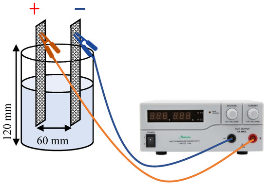 All EC experiments were performed in a cylindrical open reactor, which consisted of a one-compartment glass cell, with an internal diameter of 8 cm and a height of 12 cm, using 500 mL of effluent (stirred every 30 min with a glass rod). All EC assays were performed using a Hewlett Packard E3612A power supply (Palo Alto, USA) to apply a constant current of 50 mA, resulting in a current density of 8 mA/cm². The electrodes used were acquired from FORCE Technology (Brøndby, Denmark) and consisted of two mixed metal oxide mesh electrodes with a height of 90 mm and a length of 20 mm. Both used as anode and cathode, these electrodes were in a fixed position inside the reactor, at a distance of 50 mm from the bottom and 60 mm from each other (Figure 1). All experiments were performed with effluent spiked with CECs (three or nine, depending on the experimental set) at a concentration of 200 ppb each.