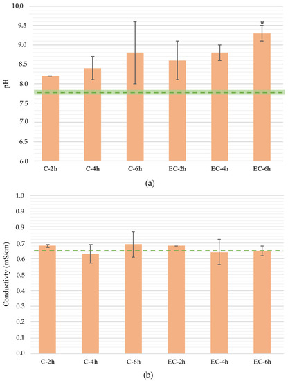 Slight changes were observed in the effluent pH (Figure 2a) when EC was applied during the treatment time, with statistical differences (p < 0.05) being only observed for the treatment carried out for 6 h (EC-6h). The pH increase is attributed to the generation of OH– at the cathode [21] that are not completely counteracted by the H+ formed at the anode.