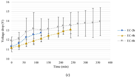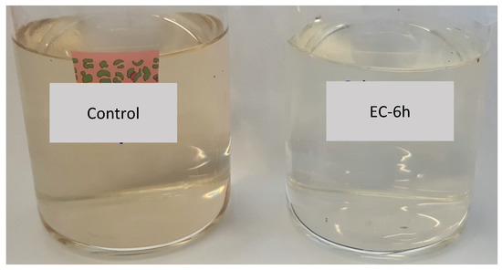 A tendency for a voltage drop increase was observed as the EC treatment time increased (Figure 2c), with a ΔV of +1.5, 1.9, and 2.1 V for EC-2h, EC-4h, and EC-6h, respectively. However, statistical differences (p < 0.05) were only observed in EC-4h (11.2 ± 0.1 and 13.1 ± 0.4 as initial and final values, respectively). This increase is attributed to the depletion of ions in the effluent, although this does not directly correlate with the conductivity. Still, the degradation of dissolved organic matter was observed along the experiments, and a more transparent and lighter effluent solution was distinguished at the end of the experiments (Figure 3). This can, to some extent, explain the increase in the voltage drop.