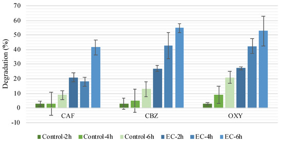 CAF showed to be the CEC least susceptible to electrodegradation as less of this compound was removed, with the maximum degradation of 41 ± 7% after 6 h (EC-6h). CBZ and OXY presented similar levels of removal along the treatment, approximately 27%, 42%, and 53% for EC-2h, EC-4h, and EC-6h, respectively. Compared with controls (without applied current), the effect of applied current enhanced by ~10–70% CAF, CBZ, and OXY removal. The electrodegradation trend was the following: OXY > CBZ > CAF.